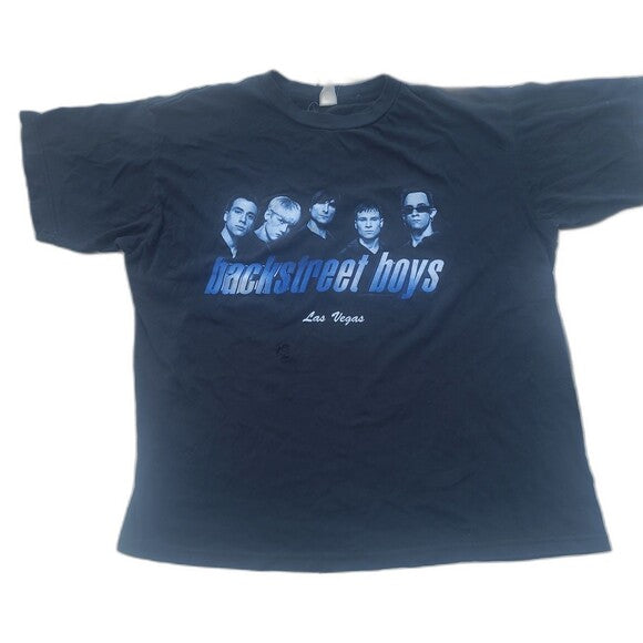 This authentic Vintage Backstreet Boys Las Vegas t-shirt is official 1998 concert tour merchandise, representing a true collector's item for fans and vintage apparel enthusiasts. Crafted from super thin fabric with a washed tag, it shows natural wear including two thrashed holes on the front and back, reflecting its well-used, lived-in character. There are no stains, preserving its vintage appeal.