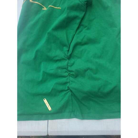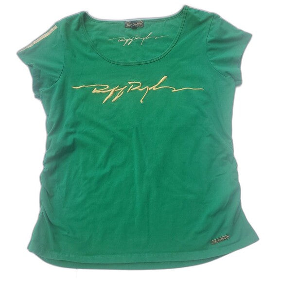 This Vintage Ruff Ryders Y2K shirt from the Applebottoms era features green and gold embroidery throughout. It is gently worn with no stains or holes, though the gold plating has come loose.