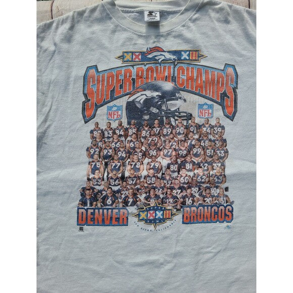 Vintage Starter Denver Broncos Superbowl XXXII Champions NFL t shirt . Official Full roster photo w/ Legends John Elway and Terrell Davis
