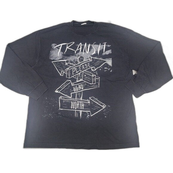 This vintage Transit band long-sleeve tee, featuring the "Please Head North" design, is a size XL with measurements of 23" pit to pit, 28" length, and 22" shoulder to shoulder. Free of holes and stains, it showcases the pop-punk and alternative rock vibe of Transit, a Stoneham, Massachusetts band formed in 2006, known for their reflective lyrics, especially from the album "Joyride." Please review photos carefully; as a vintage item, some wear is expected. Items are sold as shown.